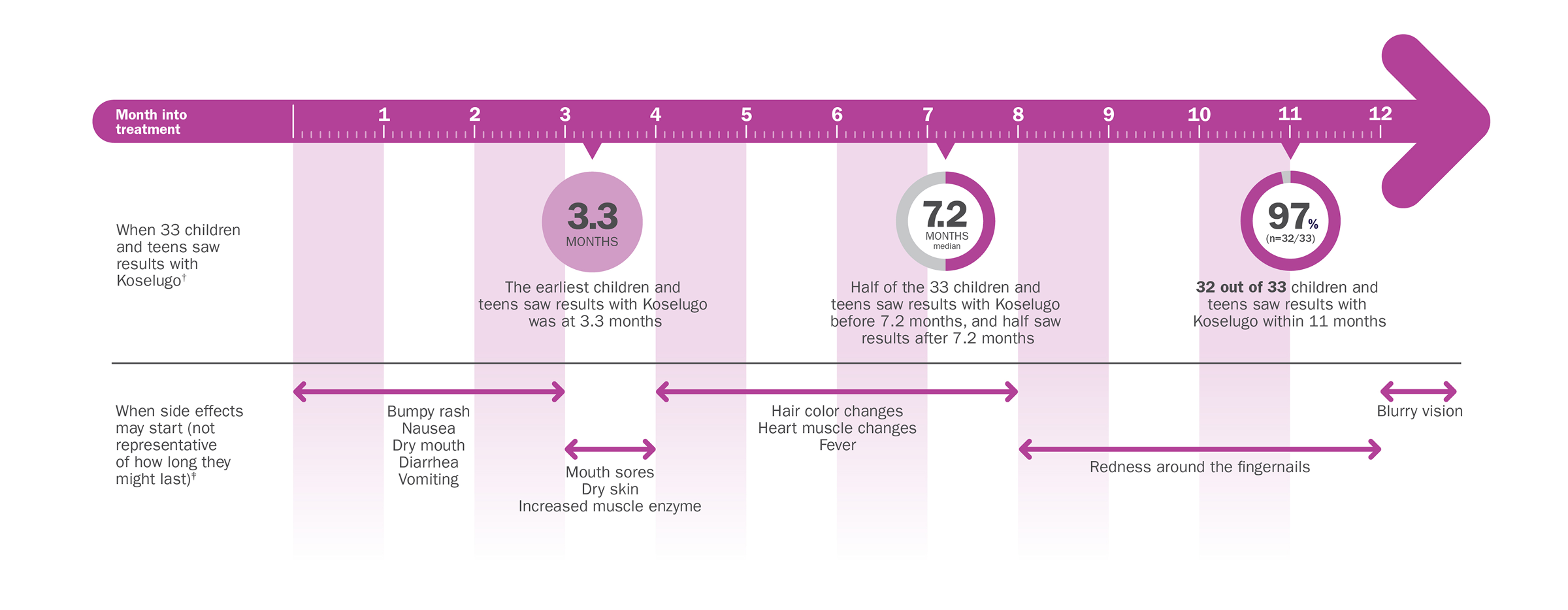 The timeline below uses data from the SPRINT Phase 2 Stratum 1 study to visualize what children and teens may experience during their first year of taking Koselugo.